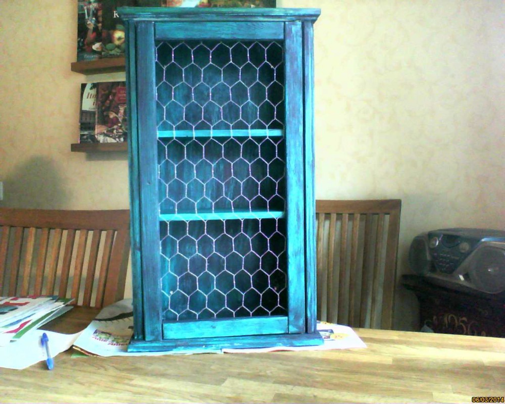 Jag har målat om ett furuskåp, tagit bort glaset och satt dit hönsnät istället.
